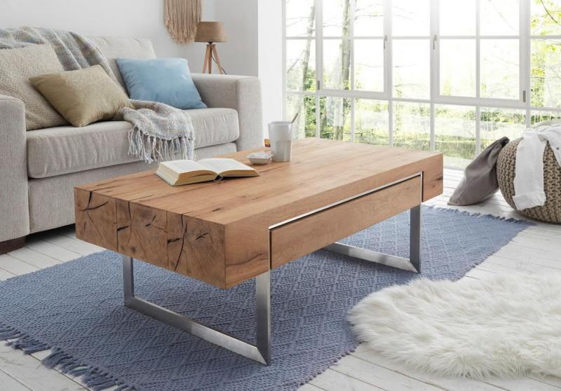 Der Couchtisch strahlt in seinem rustikalen Design und glänzt durch die schicken Edelstahlbeine.