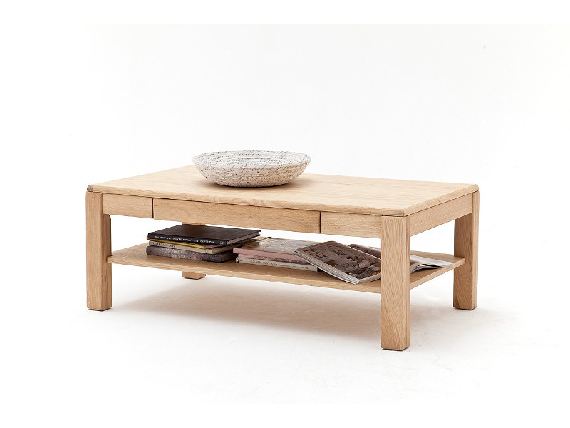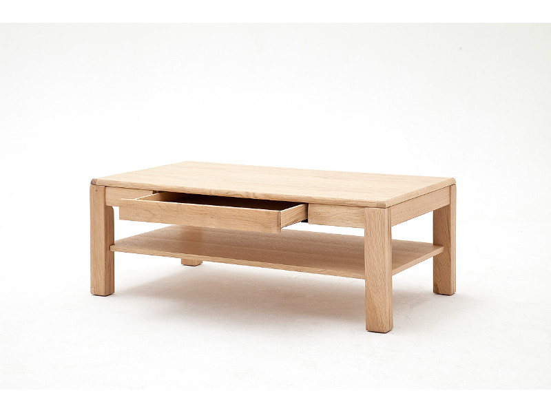 Die Füße & Zargen sind gefertigt aus massiver und geölter Eiche Bianco. Die Tischplatte ist ca. 20mm stark, furniert und mit massiven Anleimern versehen. Dank eines praktischen Schubkastens und eines Ablagebodens bietet der Couchtisch eine Menge an Stauraum für Zeitschriften, Fernbedienungen und mehr.