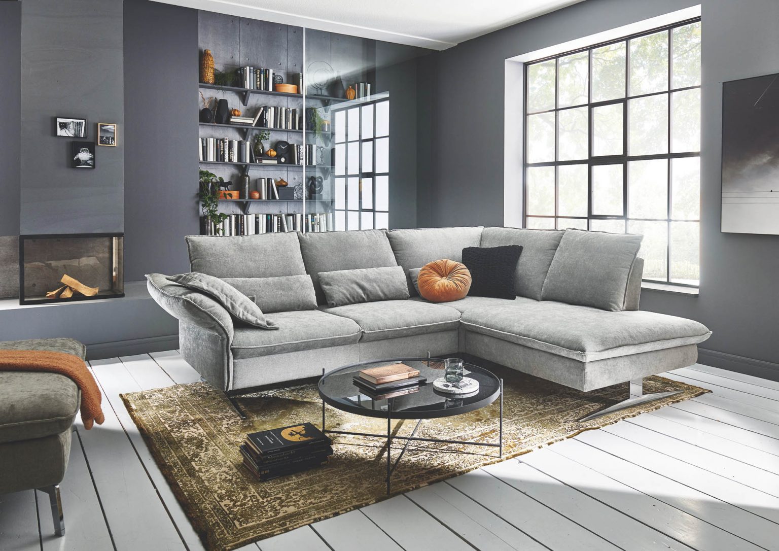 Die Eckgarnitur 1043 ist ein echter Blickfang. Die moderne Optik mit den Kufenfüßen in verchromt, lassen keine Wünsche offen.