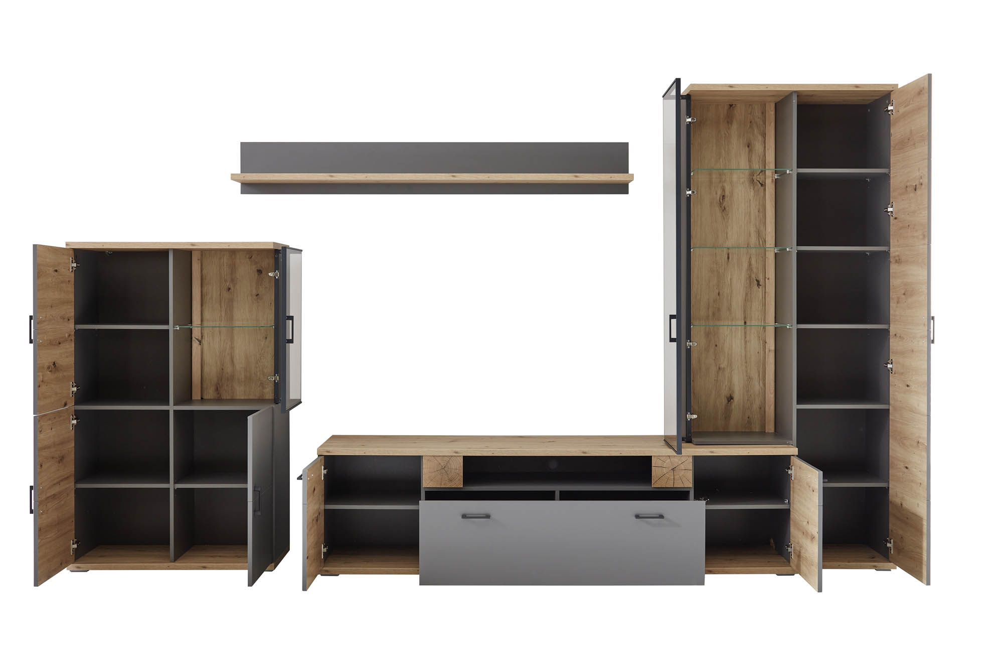 Neben der tollen Optik, bietet die Wohnkombination viel Stauraum in den Vitrinenelementen, aber auch im TV Teil.
